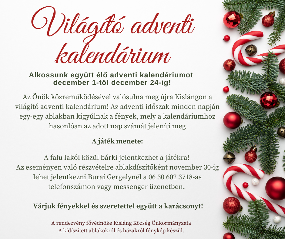 Az Önök közreműködésével valósulna meg újra Kislángon a világító adventi kalendárium! Az adventi időszak minden napján egy-egy ablakban kigyúlnak a fények, mely a kalendáriumhoz hasonlóan az adott nap számát jeleníti meg