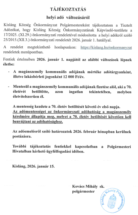 Tájékoztatás helyi adó változásról