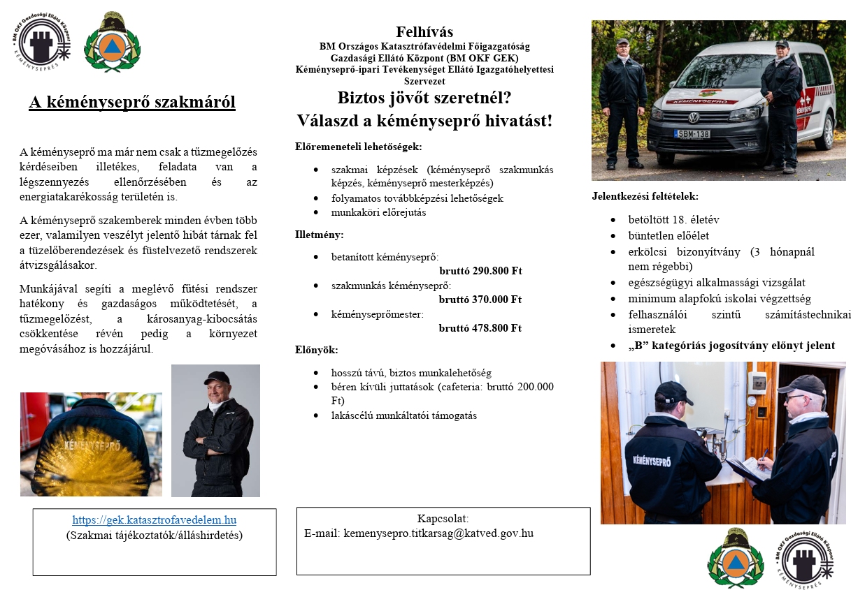 Kéményseprő mestereket, szakmunkásokat és betanított munkásokat keres a BM Országos Katasztrófavédelmi Főigazgatóság.