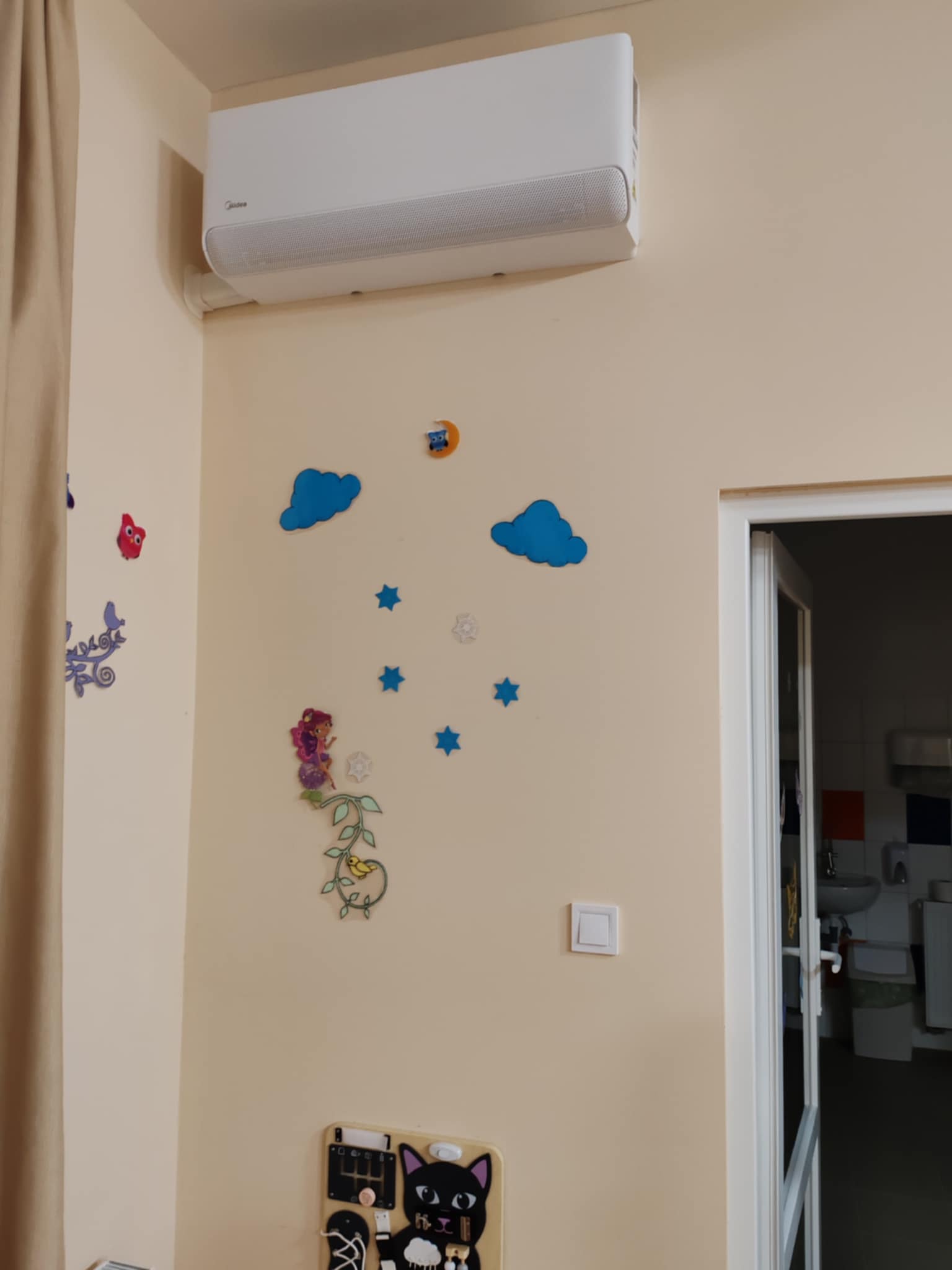 A bölcsőde mindkét helyisége klimatizálva lett, biztosítva ezzel a gyermekek számára a megfelelő hőmérsékletet és a komfortos környezetet.