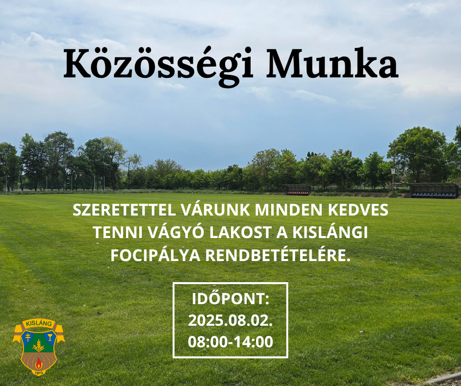 Kisláng Község Önkormányzata közösségi munkát szervez 2025. augusztus 2-án, szombaton 8:00 és 14:00 óra között a kislángi sportpálya rendbetételére.